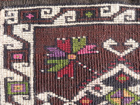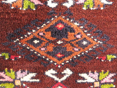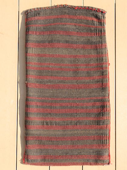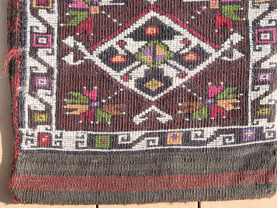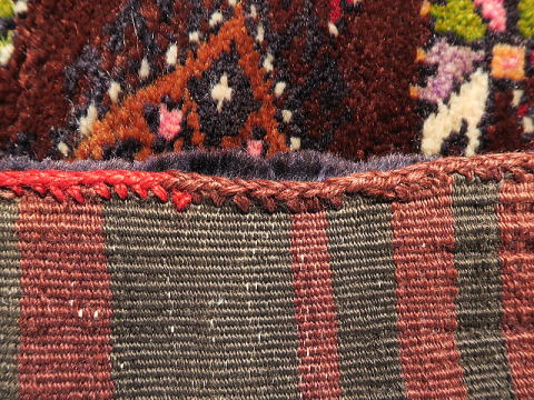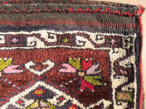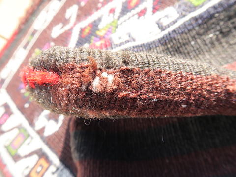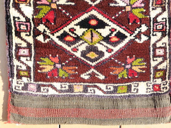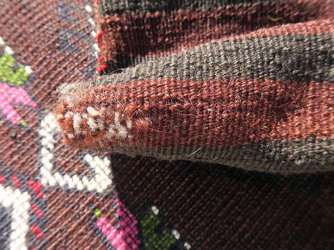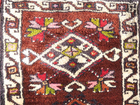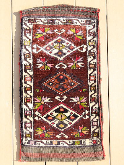 | シャワックの袋のまま絨毯。 全体的に暗め(濃いめ)の配色の為、画像ではやや明るく映し出されています。 数年前にマラティアで買い取ったシャワックです。 くどいですが、シャワックの絨毯やキリムはもう田舎からは殆どできません。 マラティアで在庫に持っている人は私の知る限り誰もいませんが、地元で一番顔の効くボスの場合、偶に手に入るそうで、これも彼が買い付けた2・3枚のうちの一枚。 流石にもう以前の様な総天然色のものは無理ですが、幸い、これは褐色部分が茜で染められています。 黒っぽい紺色も藍染だと思います。 加えて、毛並みは抜群です。 背もたれのクッションとして使われていたのでしょう、パイルに擦り減りは一向に感じられません。 織られた当時のままの、やや長めのパイルは触れると何処かコシがあるので、シャワックを知っている人にはそれと分かります。 もし、知らなくても何となく分ると思います。 表面の画像はパイルがある所為で、精巧な絨毯だと言われてもピンときませんが、裏面の画像をご覧頂ければ、パイルの並びはとても密で見事な職人技が見て取れます。 シャワックはどれもパイルが密ですが、これの場合、気持ち太めのパイルを櫛で叩き詰めてあるので、隙間がなく、びっしりです。 ※裏面は表より色合いがやや濃厚です。 年代こそ少し若いものの、往年のシャワックらしさが存分に感じられるので買い取りました。 背面のキリムは、切り離すか思案して現状維持。 左右にはシャワックらしいかがり糸までが残っており、切り離すのが惜しい。 しかし、最後の画像にある通り、袋の下、左右の端にささやかなダメージがあります。 これを修理するのは難しく、緯糸を入れると隣接する緯横が解けてしまいます。 結局、大掛かりな入れ替えをしなければならず、そうかと言って、そこまでの重要性はありません。 背面を切り離してキリムにする希望がありましたら、キリムと絨毯の房止めと簡単なストレッチの費用(3,000円)をお願いします。 なお、このヤストックはイスタンブルにてプロのクリーニングを行っています。 |