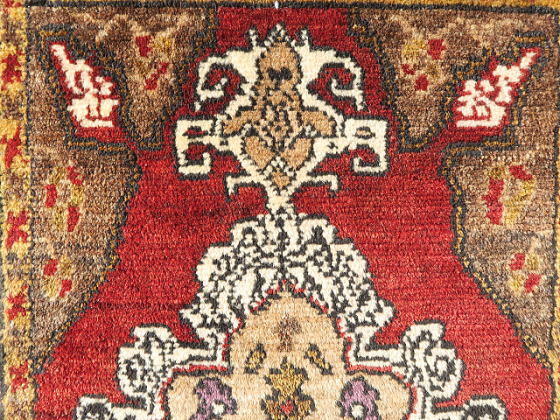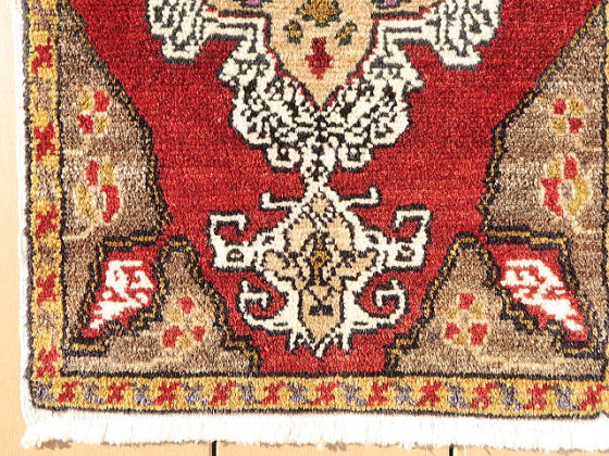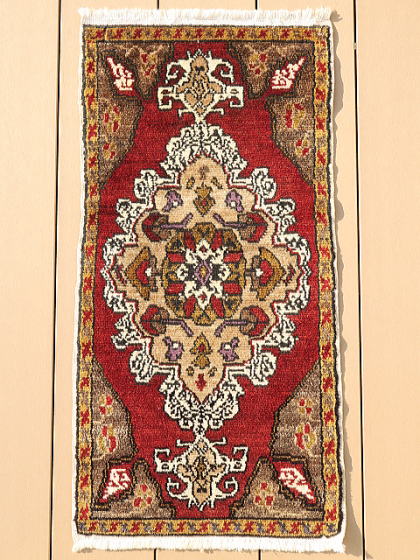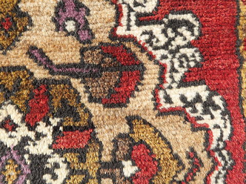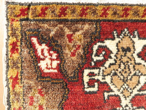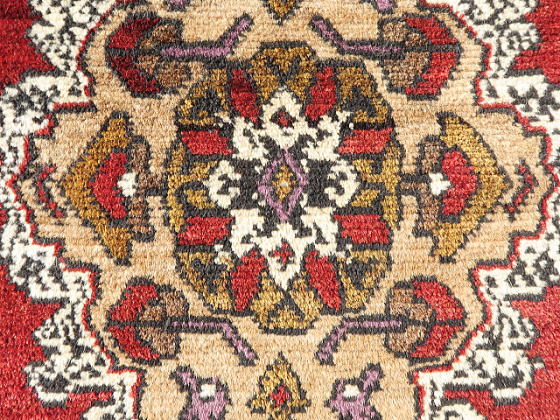| カイセリ県イェシルヒサル地区のヤストック絨毯。 イェシルヒサルはカイセリ県の南西部に飛び出した部分、ネブシェヒル県との県境に位置しています。 そういわれてもピンときませんが、トルコで一番有名な観光地、ギョレメ国立公園から南下したところにあるデリンクユ/Derinkuyuの地下都市の近くと言えば、殆どの方が想像つくと思います。 実際、イェシルヒサル地区にも地上に洞窟遺跡があります。 昔から農業を営んで来た土地柄、遊牧生活を辞めて地元に定着していた人達が、食事の際等背もたれに当てる絨毯として、木枠にはめ込んで使われていました。 コーナー部の浸食、凹になった部分は極僅かで、それほど過密に並べていなかったのかもしれません。 デザイン面ではご覧の通り、手の凝った作りをしており、このデザインを織り上げるのは容易な仕事ではありません。 それも、家族で手分けして何枚も織る訳ですから、一枚ずつ表情が違います。 農業を営んでいた所為なのか、草花の模様を多く取り込んでいるのもイェシルヒサルの特徴です。 また、この年代が茜由来の天然色が使われる最後、これより若くなると全てが化学染料にとって代わります。 また、イェシルヒサル絨毯のパイル厚は平均程度。 マラティア等手に取った瞬間に重く感じる物もありますが、これは明らかに軽いです。 東部地方ほどには寒くないとか、いろいろいな理由があると思いますが、基本的に中央アナトリアはこんな感じです。 裏面のパイルの並びをご覧頂ければお分かりの通り、目の詰まり具合はノーマルグレードです。 なお、価格を低く抑えるため、最終的に私が手洗いしています。 洗剤を使用すると色移りの可能性がありますが、水だけで手早く洗うならばご自宅での洗浄も可能です。 ※細かい事は、事前にお問い合わせ下さい。 |