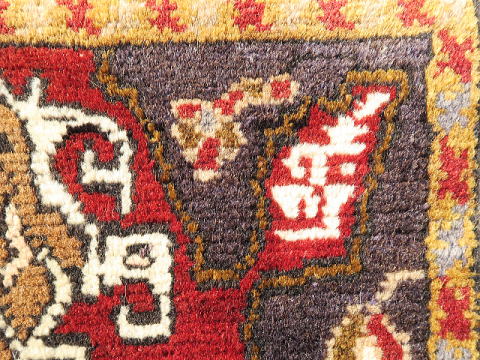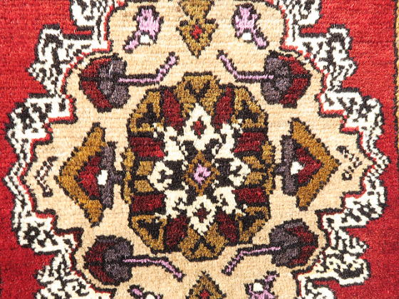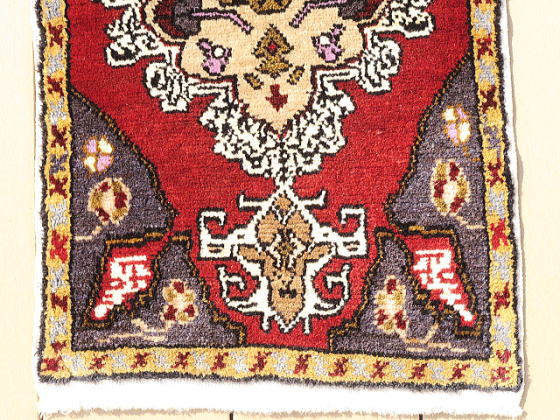 | カイセリ県イェシルヒサル地区のヤストック絨毯。 イェシルヒサルはカイセリ県の南西部、ネブシェヒル県との県境に位置しています。 トルコで一番有名な観光地、ギョレメ国立公園から南下したところにあるデリンクユ/ Derinkuyuの地下都市に近く、イェシルヒサルの郊外にも洞窟遺跡があります。 昔から農業を営んで来た土地柄、遊牧生活を辞めて地元に定着していた人達が、食事の際等に背もたれに当てる絨毯として、木枠にはめ込んで使われていました。 デザイン面ではご覧の通り、非常に入り組んだ形をしており、このデザインを織り上げるのは容易な仕事ではありません。 ただし、御覧の通り変形があります。 織り手自身、織り進めながら歪んだのが分かって頑張って修正したようです。 その所為あって、絨毯のデザインそのものはそう変形していません。 フラットな絨毯なので、敷いてしまえば絨毯としての役目に違いがある訳ではありません。 ※撮影後、現在、自宅で軽くストレッチを試みています。 ミリ単位で改善していると思いますが、見た目の変化は殆どないと考えて下さい。 実用重視でベースの変形を許容して頂けるのであれば、お買い得に感じられるような価格に設定しました。 |