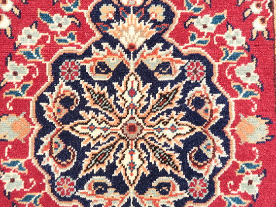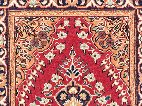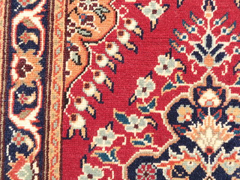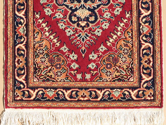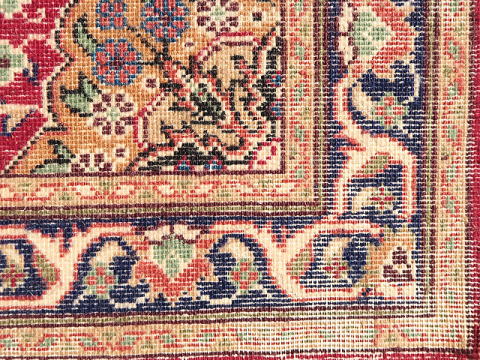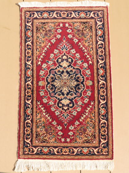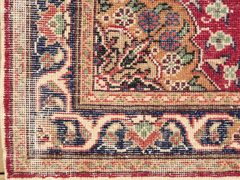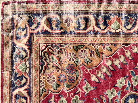 | ハジュラル絨毯の4枚目。 表面から見る限りでは、他のハジュラルと同じです。 それなのに価格が安いのは、裏面が蛾によってパイルが浸食されているため。 蛾の習性として、端の狭い所を好むので、これも裏面の端の方が浸食されています。 洗っても、今のところパイルの脱落はありませんでしたが、将来は分かりません。 もし飾りとして使うのであれば、何ら支障はなく、日常的に使うのでなければ、敷物としても直ぐに壊れるものではありませんが、それは保証できかねますので、あくまで飾り用としてのご紹介です。 |