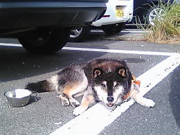 駐車場で待ち合わせ、鉄黒豆は上半身をここまでしか起こせなくなっている。 (-_[◎]o→