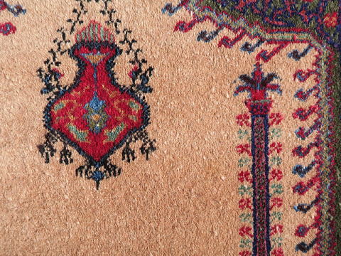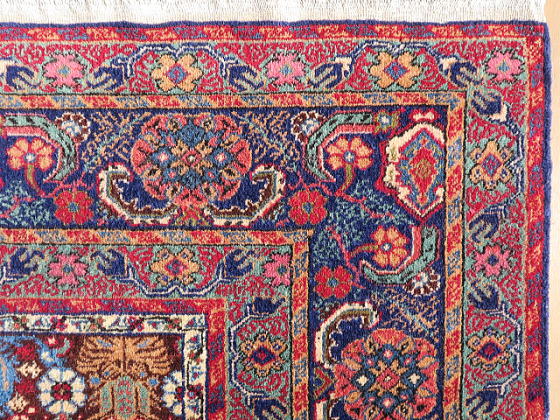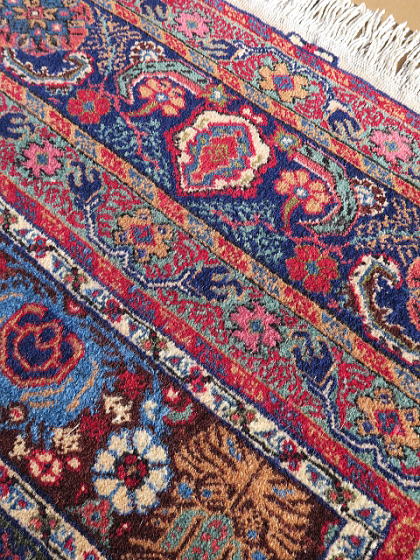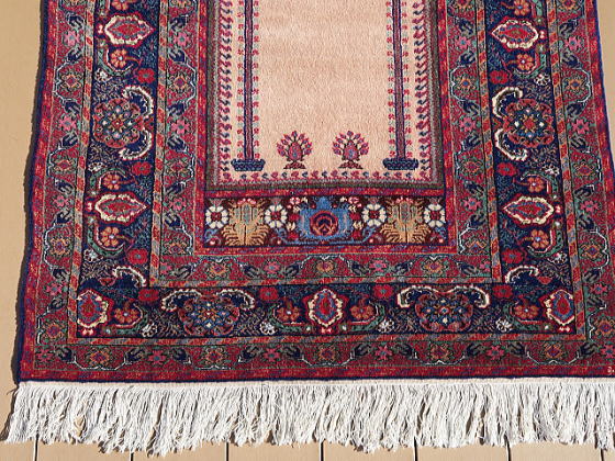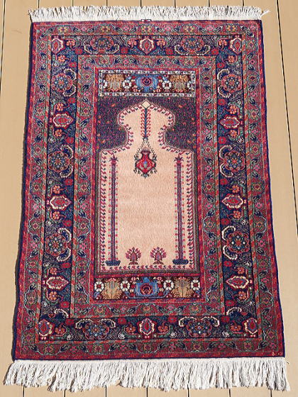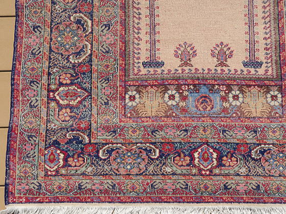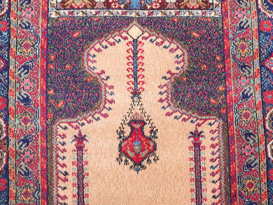 マンチェスター絨毯の最高峰、ほぼ未使用品です。 手織り絨毯であるマンチェスター絨毯はいくつかのクラスに分類され、素材や品質にも微妙な違いがあります。 当時、工房が腕を競い素晴らしい作品を生み出していましたが、誰もが最高峰の絨毯を制作できるわけでは無く、一部には素材や品質に劣る安価なタイプ、普通のカイセリ絨毯と何ら変わりないものも存在します。 私自身、マンチェスターが終わったと聞かされていたのに、カイセリである店に入ると壁一面に積まれた絨毯がマンチェスターの山だったりします。 それで訳を聞くと、ビュンヤン程度のカイセリ絨毯はマンチェスターと呼ばないそう。 生粋のカイセリ人、代々続く絨毯屋である彼なりのこだわりだと思います。 そういった事情を踏まえた上でこの説明に入ります。 カイセリ滞在中、その友人から高齢(70代後半)のオーナーと知り合いで、親兄弟から譲り受けた絨毯類を在庫に抱えているので見に行かないか?、もし彼が亡くなると、何も知らない家族が安く売り払う事になるからと誘われました。 彼の説明では、店内は30年前のままだそうですが、店内は綺麗に整頓されており、全く営業していないのではなく、少しずつの商いは行われているようでした。 店の壁には、かつての栄華を偲ぶように素晴らしい作品が陳列され、2階の特別室には市場から消えたはずの上等なマンチェスター絨毯やカザック等の有名絨毯が山と積まれていました。 ここで、「これは安くはないぞ」と思いました。 案の定、試しに価格を尋ねるとかなり高い上、一向に価格交渉で譲ってくれません。 友人が必死に食い下がって交渉を進めていますが、無理してまで欲しいわけでもなく、諦めて店を出ようとした時、とても強引な価格交渉で買い取ったのがこちらです。 私自身、気に入っていたので高くても良いとは思いましたが、販売は難しい気がします。 カイセリでマンチェスター絨毯の制作が本格的に始まり、10年程度が経過したごく初期の頃の作品です。 初期のマンチェスターは天然色に染めたウールを持ち込んだと言われ、実際、その友人が家族代々受け継いているマンチェスター絨毯の壁飾りと個々の色彩がとてもよく似ています。 制作後に少し位は使われたと思いますが、元々、丈夫に作られている絨毯ですから、びくともしていません。 ほぼ全てが完璧に出来ているので、トルコで一番優れているクリーニング店で洗っただけ。 織り上がった当時のままの長いコットンの房といい、何も知らなければ、まるで今織りあがったばかりのようですらあります。 そのデザインは正にマンチェスターの工房が考えに考えて生み出したもの、超過密なデザインはその努力の賜物、最高クラスに位置づけられる品物です。 ミフラブ上方、フリンジ手前のスカート部分に工房の印(しるし)のようなものがあります。 マンチェスターの祈祷用は数あれど、ここまで手の込んだ、状態の良い物は初めてで、今後とも出てこないと思います。 かつてカイセリでも繁盛店だった店の壁に何十年も掲げられてきたものですから、生涯の宝物としてコレクションに加えていただければ幸いです。 |