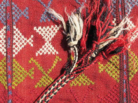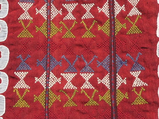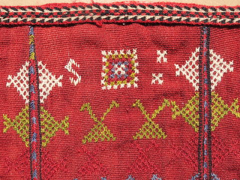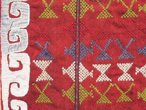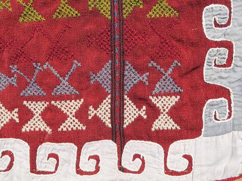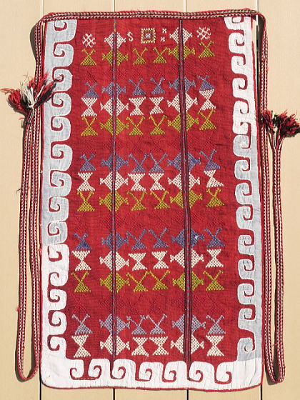 | 簡単に言えば、シワスジジムのエプロン。 エプロンのキリムは時折見つかる事がありますが、大抵はもっと簡素な作りをしています。 これは人に見られることも意識したような、非常に手の込んだ造りが自慢、一枚物の小さな赤いジジムと同等かそれ以上の評価が出来ます。 このジジムのベースは態々3枚のキリムから成り、そのつなぎ目の表面にはジジム風の装飾を入れる事で、繋ぎ目を隠してあり、裏面を見て初めて3枚のキリムで出来ていると分かります。 模様配置から推察して、このデザインの実現にはそれぞれに別々のジジムが必要だと判断したのだと思います。 その為、個々のパートの模様は縦・横方向共にかなり整合しており、同じ模様の繰り返しとは言え、赤だけのキリムベースを織りながらの連続模様の調整はさぞ大変だったでしょう。 そして、出来上がったエプロンには綿布で羊の角をデザインした模様を縫い付けた後、エプロンの外周部分にかがりを入れて補強してあります。 最後に、長いコロンを別途制作して、縫合したら出来上がり。 その長さと端の装飾から、エプロンを背中で結ぶのではなく、前方に持ってくるのかもしれません。 こうして見事なエプロンに仕上がりましたが、果たして、実用に使ったのかが不明です。 丈の長いエプロンはまるでスカートの様ですし、コロンは見た目と強度は良くても、結び目が大きく、エプロンそのものも重くなります。 むしろ、このデザインならばお祈り用としての利用価値の方がありそうで、実際、そんな感じさえ伺がわせるデザインです。 それ故、ディスプレイ等にすれば、かなり目を引きます。 世界でたった一枚の手作りのエプロン、ほぼ天然色です。 |