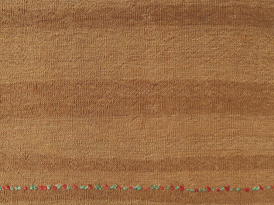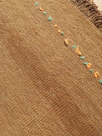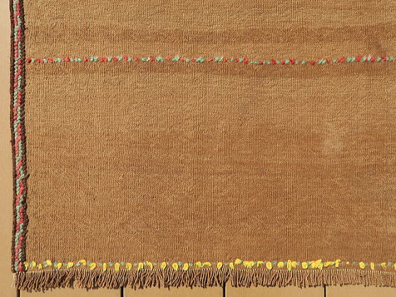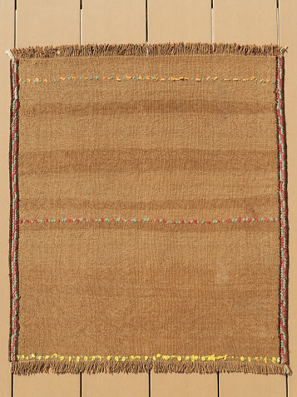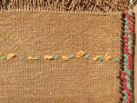 | ベラミンのラクダキリムを半分に切り分けたもの。 古い画像を探したところ、イランの田舎で撮影したと思われる当時の画像が見つかりましたので、参考画像としてご覧下さい。 破損があるのは細々と上下だけか?と思っていると、真ん中辺りにも左右の端に切れ込みがあった為、洗った後で2つに切り分けて房止めしました。 全体画像の上半分がこれです。 おそらくソフラの一種で、パンをこねるものか、食卓用のキリムです。 ご覧の通り、経糸もラクダの毛、僅かばかりの装飾を除けば、ほぼラクダで出来ています。 薄手のキリムなので、敷物とするには場所を選びますが、それでもスリットの無い構造かつ年代物らしい織りの細かさもあり、敷いて使ったとしても直ぐに破損するようなものではありません。 イランのキリムですから、ある程度の実用性、強度も考えて作られています。 |