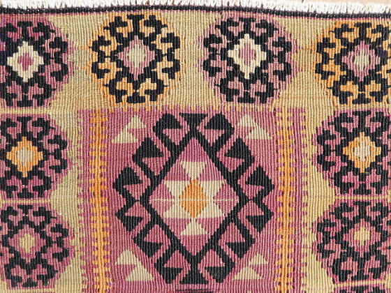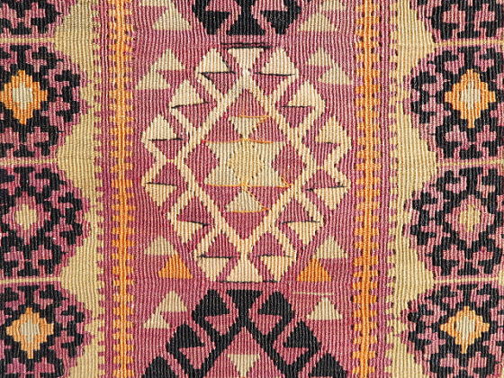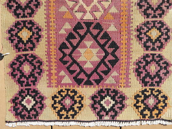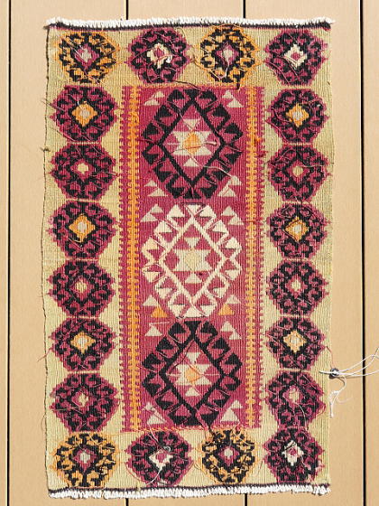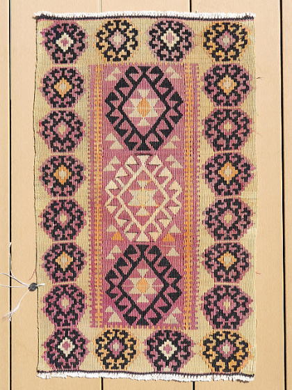 | マラティア県イェシルユルト(YEŞİLYURT/緑の国)自治区、ポルガ(村)のキリム。 マラティアの友人から買い付けた正真正銘のポルガです。 イェシルユルト自治区は、行政区分の変更によりマラティア市と合併したので、今は首都の行政区ですが、実際はやや南方に位置しています。 雪深い土地でもあり、春先にマラティア市を訪問して、遠くに見える雪が被った山々がこの地区です。 さて、本題のキリムはS340とほぼ同等、ほぼオリジナルで残っています。 もう一枚より色褪せしているのは、アクサライに送って修理してもらったため。 何処を修理したのか記憶がありませんが、ご覧の通り色合いが違うので、二枚の内これがアクサライに送った物だと分かります。 彼らはプロの職人なので、両面を近い色合いに調整します。 ただ、色合いを調整するなら、裏面を少し退色させれば終る筈です。 なぜ、表(おもて)面も色褪せしているのか謎でしたが、今回、掲載画像を準備していてその理由が分かりました。 もう一枚、色濃い方の画像を細かく見ていると、些細な色移りがありました。 修理を依頼しただけなのに、些細な色流れを見付け、それを消すために少しだけ表面を色褪せさせてから、微妙に裏面もトーンを落として仕上げた訳です。 私が2枚セットで依頼したのでその理由が分かりましたが、そうでなければ永遠に謎のままでした。 ポルガらしい渓谷に咲き乱れる花柄をイメージさせる図柄で構成されており、豊穣と水をもたらすドラゴンを描く事で完結しています。 後、もう一枚とは作風が少し違うため、姉妹の作品だと思います。 やや薄手な上にスリットが多いので、玄関マットよりも負荷の少ない場所での利用が向いています。 左辺に見える飾りの様なものは、輸出に際して税関が許可を出したという証拠の封印で、残してあります。 (紐を切れば、外せます。) |