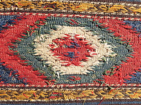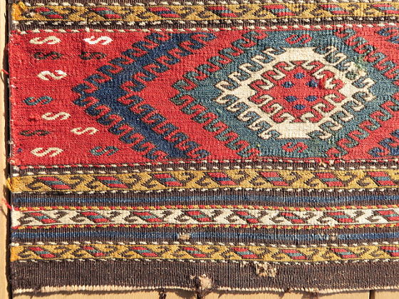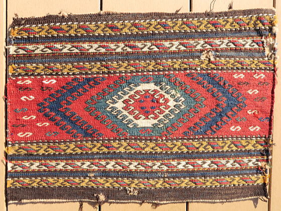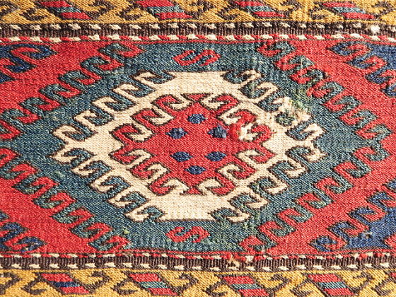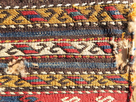 | イラン北西部に居住していたシャサワン族の衣装袋側面(小)。 デザイン的にも一番人気のドラゴンスマックで織られ、品質も高く、色合い、デザイン性とも素晴らしい。 ここでいう品質とは、紡いだ糸の細さと、その結果として現れる本体の薄さとしなやかさです。 鋭角な角の模様は糸が細く仕事が細かい事の裏付け。 上下のボーダー部に描かれたフック背面の黄色の濃さを見て下さい。 表面の緑はほんの少し退色していますが、裏面を見ればもっと濃厚。 古い緑色は黄色を藍で上染して染めるため、その中に含まれる黄味が退色しやすいからです。 制作された当時は、どの色も物凄く濃厚な色だったと思います。 このパネルは、S342よりダメージがあります。 ただし、スマックの構造上、解けてくるものではないので、ここには何かしら古い端切れを当てて頂ければ十分かと思います。 価格を安く設定していますから、飾りとするのであれば十分過ぎる状態です。 現状は洗っただけですが、上下の房止め(補強が必要な部位の経糸+αの小さな修理)は追加で行います。 |