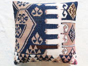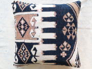 | シナン(S334・S335)の残り部分をクッションカバーに仕立てました。 濃紺と白いコットンのコントラストの中にコチニール由来の赤色とシンプルなだけに、下手なごまかしの効かない シナン独特の模様が描かれたキリム。 加工する前まで、キリムとして見た時の色彩の単調さが気になっていたところ、小さなクッションカバーにする事で、 却って、その単調さが独特の味わいを醸し出していると感じるようになりました。 シナン特有の柔らかい糸で織られたアンティークですから、肌触りの点でも品質の高さも文句なし。 キリムの内側の布にはダークレッドのコットンを当てたので、スリットから覗く赤色にもセンスが光ります。 サイズの他、模様の出具合により価格差を設けました。 シンプルな物が好みの方は、お買い得です。 |