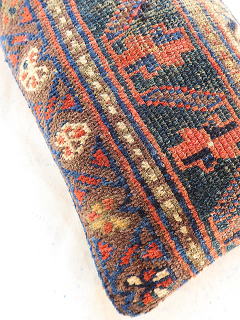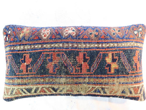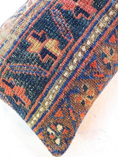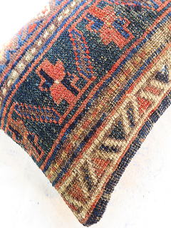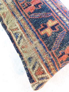 | イランはアフシャル族のアンティーク絨毯。 ほぼパイルの残るボーダー部だけのクッションカバー。 元々、40x60cmサイズに仕立ててありましたが、フィールド部分は余りにパイルが薄いので切り落としてこのサイズになりました。 内側の当て布は薄くて黒いコットンの接着芯、背面はベージュ系ライトブラウンの重厚コットン地です。 |