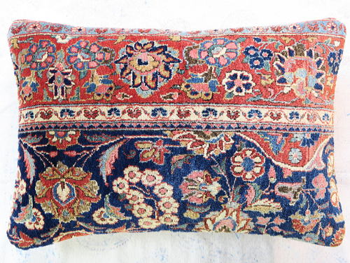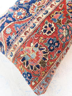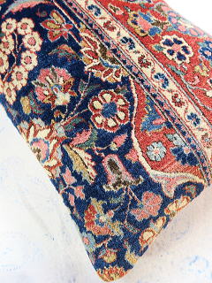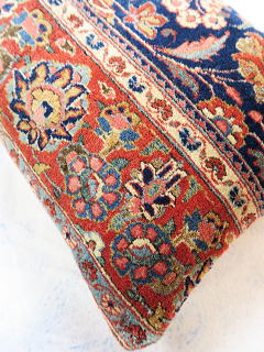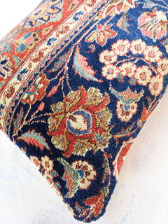 | カシャーンのアンティーク絨毯。 1900年頃に制作された、毛並みから色艶に至るまで最高の絨毯です。 全体画像の左下部の花柄のブラウンに若干のへたりが見られるので、少し値引きしていますが、半分以上が貴重なフィールド部分です。 内側の当て布はコチニール色の薄手のコットン地、後ろ面はライトブラウンの重厚なコットン地です。 |