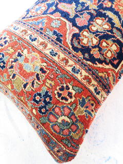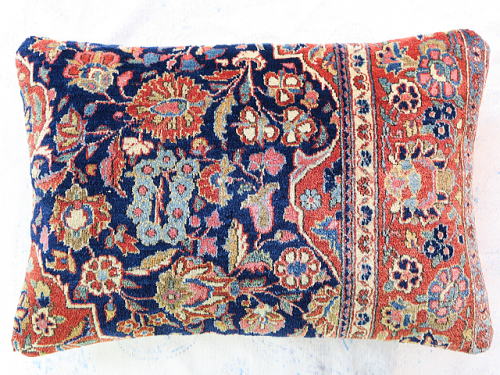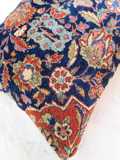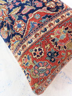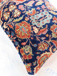 | カシャーンのアンティーク絨毯。 1900年頃に制作された、毛並みから色艶に至るまで最高の絨毯です。 全体画像の中央やや左よりの花柄のブラウンに若干のへたりが見られるので、少し値引きしていますが、半分以上が貴重なフィールド部分です。 内側の当て布はコチニール色の薄手のコットン地、後ろ面はライトブラウンの重厚なコットン地です。 |
