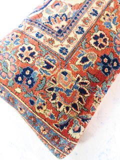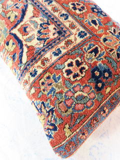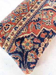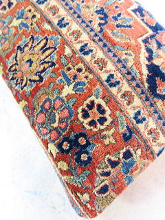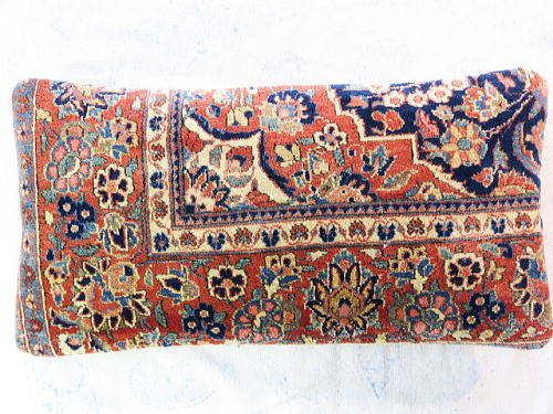 | カシャーンのアンティーク絨毯。 1900年頃に制作された、毛並みから色艶に至るまで最高の絨毯です。 小さめサイズながら、パイルの状態は抜群です。 内側の当て布はコチニール色の薄手のコットン地、後ろ面はライトブラウンの重厚コットン地です。 |