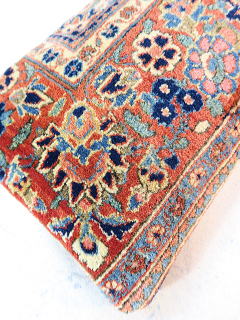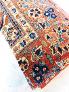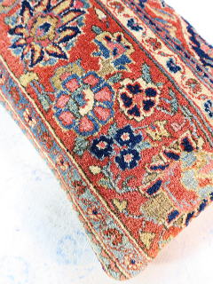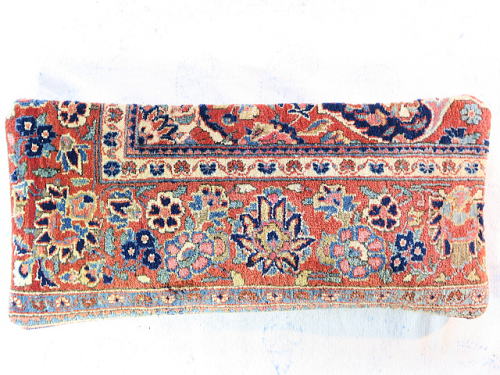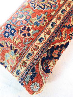 | カシャーンのアンティーク絨毯。 1900年頃に制作された、毛並みから色艶に至るまで最高の絨毯です。 小さめサイズながら、パイルの状態は抜群です。 内側の当て布はコチニール色の薄手のコットン地、後ろ面はライトブラウンの重厚コットン地です。 |