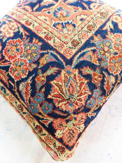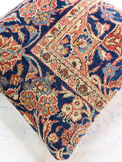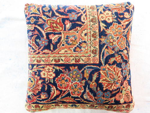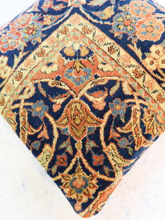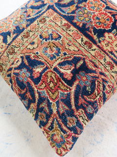 | カシャーンのアンティーク絨毯。 コーナー部ならではのフレームワークの見事さ、優れたデザイン性は他では味わえない独特のもの。 パイルは、ほぼフルパイル。 中綿が当たる内側には薄地の黒い綿製の接着芯を貼り、後ろ面はライトブラウンの重厚な綿生地です。 |