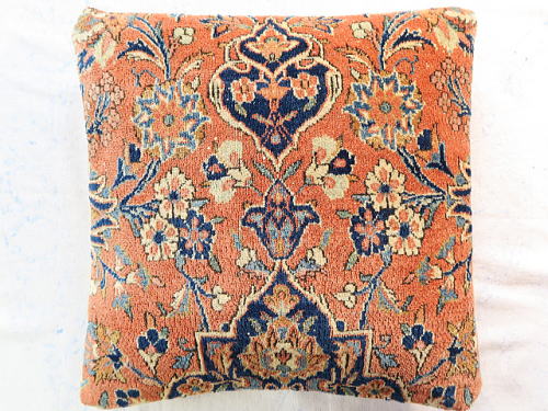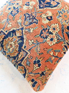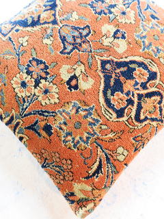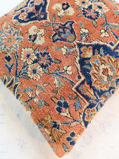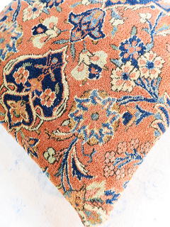 | カシャーンのアンティーク絨毯。 フィールドの中心部近くの希少かつ贅沢な一枚は、世界に一枚だけの宝物。 パイルは、ほぼフルパイル。 中綿が当たる内側には薄地の黒い綿製の接着芯を貼り、後ろ面はライトブラウンの重厚な綿生地です。 |