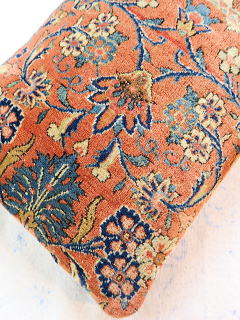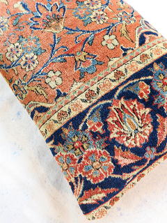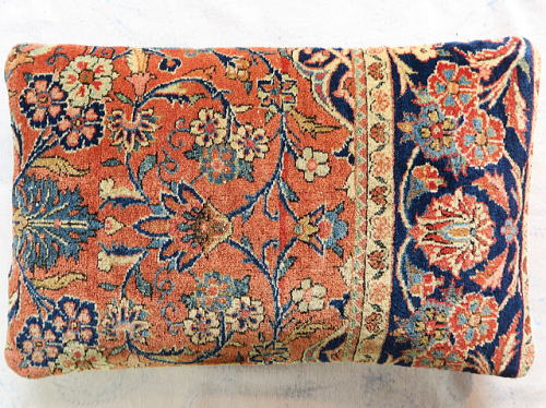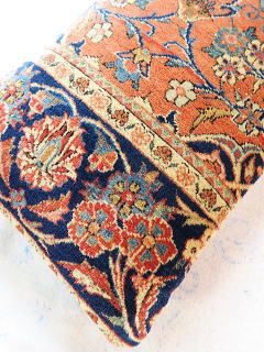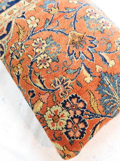 | 美しいフィールド部をメインにしてボーダーを取り込んだ贅沢なカットをフルのパイルで鑑賞頂けます。 中綿が当たる内側には薄地の黒い綿製の接着芯を貼り、後ろ面はライトブラウンの重厚な綿生地です。 |