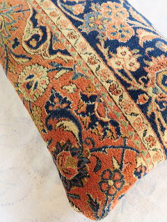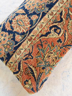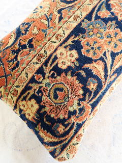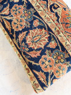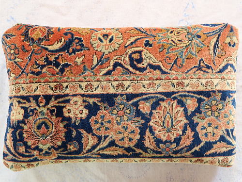 | 細長いサイズゆえ、インディゴブルーのボーダーの連続性が一際目を引きます。 パイルは、限りなくフルのパイル。 他のクッションカバーと別の日に撮影した為、色の明暗が若干異なります。 中綿が当たる内側には薄地の黒い綿製の接着芯を貼り、後ろ面はライトブラウンの重厚な綿生地です。 |