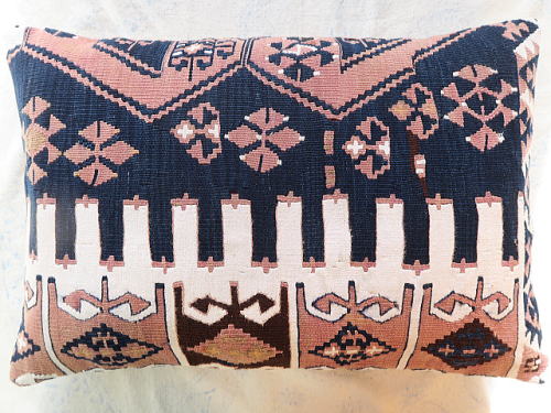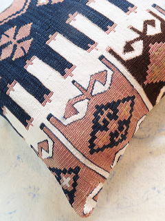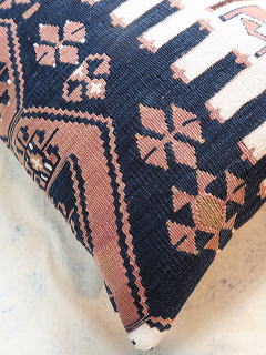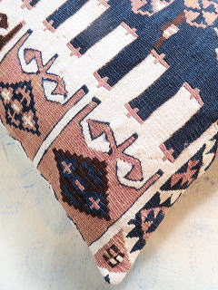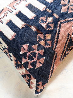 | シナンのアンティークキリム。 ボーダー部を含みますが、長いサイズにする事でコチニールの赤い羊の角が入り、 濃紺とのコントラストが絶妙です。 また、実際に見てみると、この60pもの横長の櫛模様は想定外に面白く、お守りのように邪悪な物を寄せ付けません。(恐らく) 内側の当て布はダークレッドの丈夫なコットン地、後ろ面はベージュ系ライトブラウンの重厚なコットン地です。 |