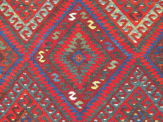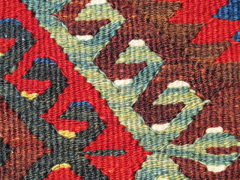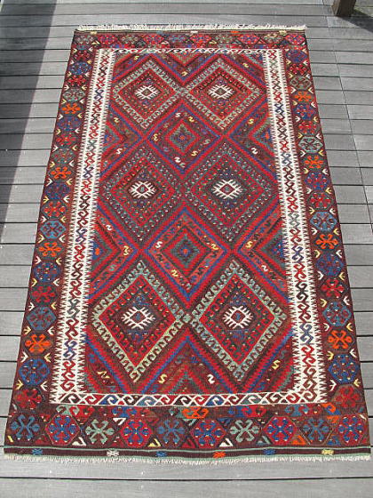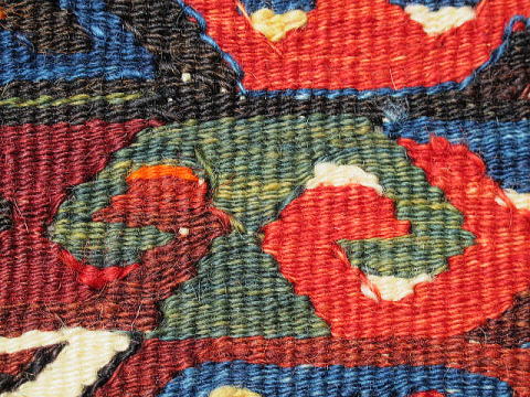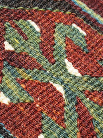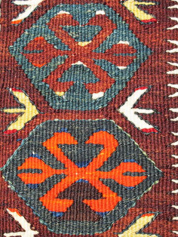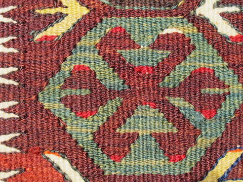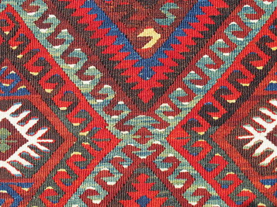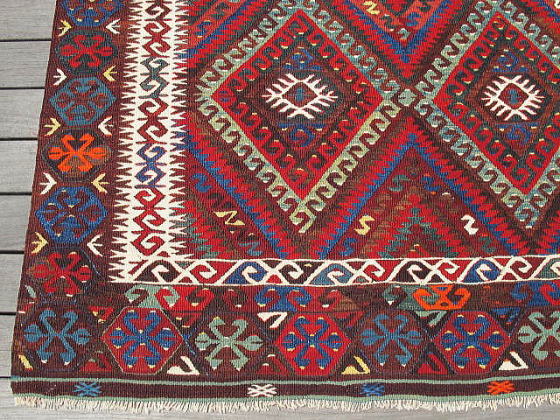 | フェティエの中でも、特に、ミフリ(ミヒリ)と呼ばれる事がある良質なキリム。 外周のボーダーにはお決まりのサソリの様な狼の口、狭いインナーのボーダーには基調色であるダークレッドとの対比で際立つ白地の中に独特のサソリ模様があり、続けて織られる事で、フックや羊の角の模様にもなっています。 そして、フィールドにはフェティエらしいダイヤ形のメダリオンという構成。 上下のスカート部には短く縞模様&プトラックのジジムがあり、これにフェティエの全てが見られます。 これだけ揃っているだけでもそこそこ見栄えがしますが、それに拍車を掛けているのがこの天然色、特に千変万化の緑色。 全体を見渡すと、緑色には黄味混じりの黄緑が二・三種類、それと、インディゴの青緑があります。 このうち、黄緑の方は、意図的にそうしたのではないかと思うくらい、激しい色むら。 遊牧民系のキリム、フェティエに色むらは付きものと分かっていても、「どうしたの?」と思うくらい過激。 古いキリムの天然色、特に緑色が好きな方にとっては堪えられません。 無論、青もインディゴ由来の色、化学染料らしい色と言えばオレンジくらい。 ただ、このオレンジは柿色に近い色合いで、少々太陽光に当てても退色しない色、私の持っている100年程前のフェティエにも同じオレンジがあります。 仮に、化学染料だとしてもボーダー部分のみ、暗めの色調の中でワンポイントの色合いとして上手く混ぜられていると好意的に見ましょう。 そうすれば、何処も文句の付けようがありません。 元々、未使用と思われる程状態が良いキリム、余り退色させる事なく仕上げていますから、その昔、アナトリアの人達がそうしたように、このまま濃いめの色合いを味わいながら少しずつ退色させて下さい。 急いで退色させたのとは違うマイルドな退色具合が、年月を経る事でのみ現れてきます。 |