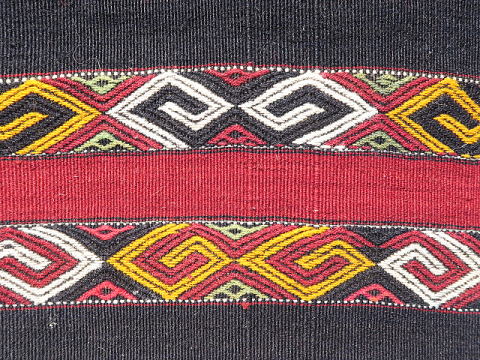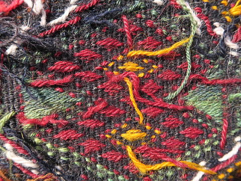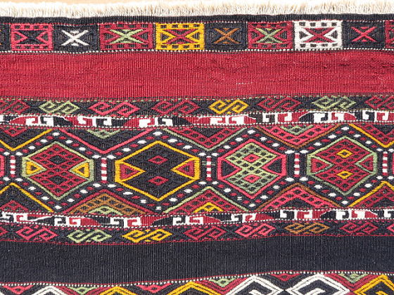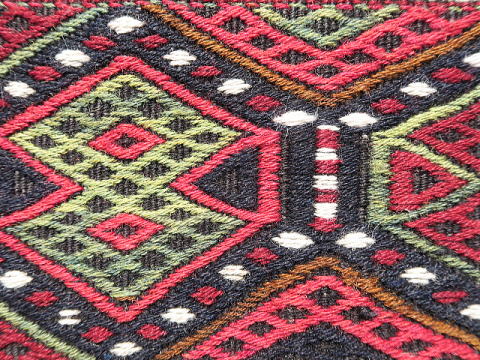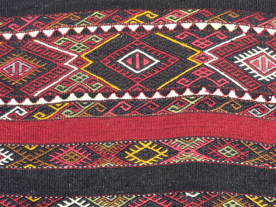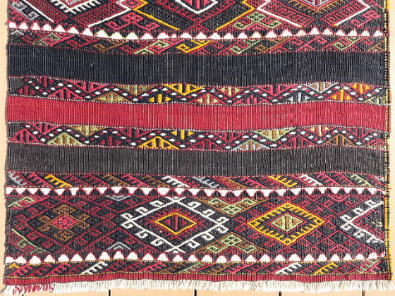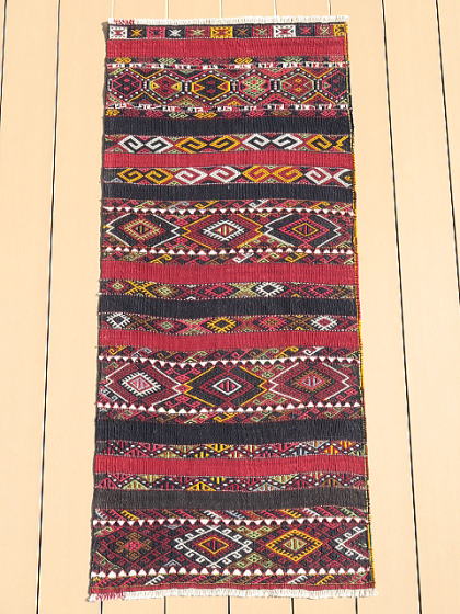 | シャワックのチフカナットを切り分けたもの、1/4相当です。 マラティアを訪問した際、偶々、店先にあり、交渉の上で買い取りました。 他のものと同じ模様配置になるようにして撮影しておりますので、上下逆さまにするとM183とつながります。 また、同じカナットなのに不思議と幅が違っており、おそらく織り進む時の後半部分で末広がり傾向に出来ており、ストレッチで成形した時にこうなったと推察しています。 ご覧の通り、これでもかとフルのジジムを織り込んであり、模様のない部分は赤と紺色の細い縞模様のみ。 シャワックはありとあらゆる織物を産出し、ジジムそのものが珍しい訳ではありませんが、彼らのジジムはもっとゆったりしているのが普通なので、ここまで立派なものは極稀。 その上、彼らの織物は一つずつに表情があり、これも模様が生きているかのように躍動していると感じます。 詳細な画像からはキリムのベースが浮かび上がるジジムの立体感、状態の良さが見て取れると思います。 黒く見えるのは紺色、アンティークでも普通にオレンジが見られる中、これには黄色が使われ、部位によって濃淡のある緑色は葉から直接染めされたもの。 薄紫は化学染料のように見えますが、マラティアでは普通に100年以上前のアンティークに使われており、地元では天然色だと言われます。 ベースの経糸は強いものが使われ、緯糸もしっかり織り詰められた上にこのジジムがあるので、敷物としてもご利用頂けます。 |