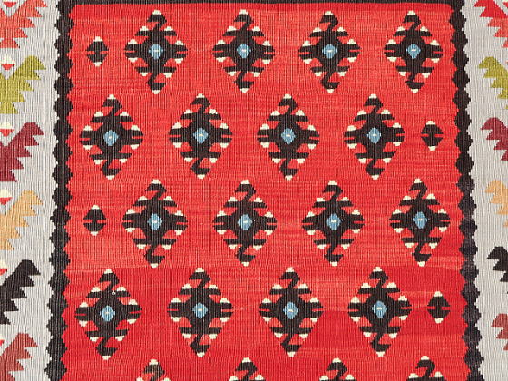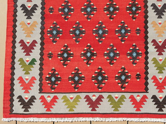 | 品筋の良さが魅力のブルガリアキリム。 その佇まいは、正にチプロフツィのクラシックと呼ぶに相応しいもの。 織りは細かく整い、キリムは至ってフラットと非の打ちどころがありません。 元々はシャルキョイの工房が立ち並んでいた土地柄、これらチプロフツィがそのデザインを踏襲して「シャルキョイモデル」を制作するのはそう難しい話ではなかったでしょう。 キリムの良さはいろいろとあり、精巧さはあくまでもその一つにすぎませんが、その技術力の高さは、並みのピロット程度は凌駕する程です。 産地のアイデンティティに拘るより、それぞれの個性で選んだ方が良いのかもしれません。 難点があるとすれば、どちらが上なのかが分からない事くらい。 今から10数年前の話になります。 シャルキョイを探すついでに、現地で選りすぐりのブルガリアのキリムが見つかれば良いなと考えていました。 しかし実際は、在り来たりの物すら見つからず、こうした選りすぐりの物を目にする機会はほぼ皆無でした。 まれに「あっ、良いな!」と思うものを目にしても、実用品であるキリムは使われていればシミはできますし、必ず何処かに小さな破損があり、大抵は修理が難しく、それならば修理の無い上等品を買った方がお得です。 しかし、それらは、販売目的か趣味なのかは別にして、地元の人がコレクションしているため、誰か仲介人に紹介して貰わない限り入手は困難。 今はまた状況が変わり、これからチプロフツィのキリムは需要と供給のせいでしょう、結果として、オールドのピロットと同じ価格帯になっていました。 それらは何も特別な物ではなく、極普通のチプロフツィです。 古いせいで、この品質が良いのか、織り子が腕利きなのかは迷う所。 年代的に天然色はあり得ないと思いますが、フィールド部分の赤は古い時代の天然色と同じような色むら。 化学染料を使いながら自然な色むらを再現した可能性もあり、その卓越した仕事振りの一端が伺える作品です。 半世紀の間、使われずにしまっておいたようなキリム、敷物に耐えうる強度もありますが、飾りとしても結構な見栄えがします。 |