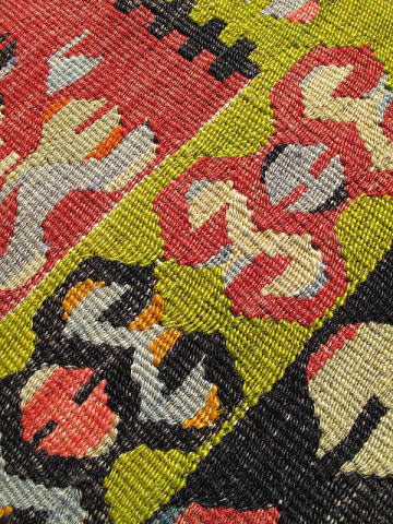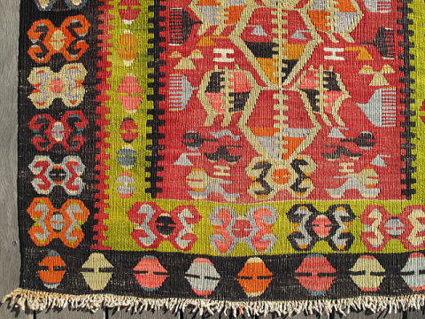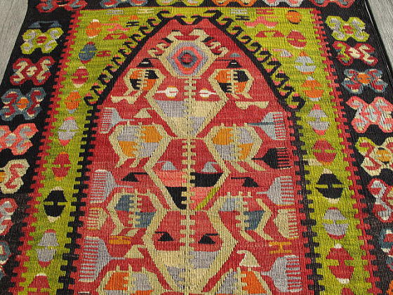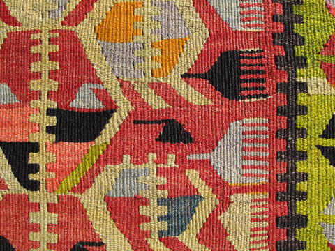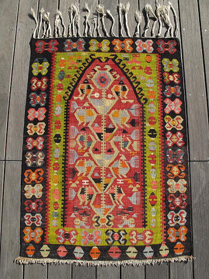| エシュメの良さが小さく凝縮されたキリム。 その素晴らしさの一つは、本来もう少し大きなサイズに織られるものが、苦心してこのサイズに収められている事にあります。 この大きさにする為、個々の模様は小さく、そして過密になり、下端のボーダーにあるブカウ(足かせ)は、模様そのものが押し潰れたように圧縮されると共に、先端部分の山の勾配を低くしてあります。 ミフラブ内でも同じく、全ての模様が効率よく隙間を空けないように配置された見事なデザイン性を誇ります。 それでいて無理矢理小さくまとめた窮屈さは無く、ミフラブトップの冠の部分は、クワガタの角の様に優雅です。 羊の角は一つで二役、中抜きの角にもなっていて、その中には小さく足かせも配置されています。 きっとこの織り手は、好きな人と一緒に暮らすことを願い、大人の女性として髪を梳く事とも併せ、外向きの櫛が外敵への備え、そして将来の出産を夢見てこのキリムの制作に当たったのでしょう。 機械織りのような精巧なエシュメではなく、手織りらしい模様の一つ一つに愛嬌、人間味のあるとても良いキリムです。 下手に色を抜き去る事なく色濃いままに残したので、当時の面影がよく偲ばれます。 |