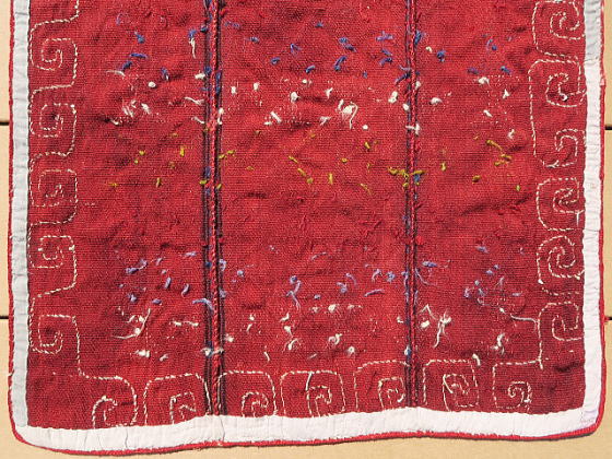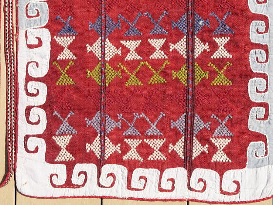| 簡単に言えば、シワスジジムのエプロン。 エプロンのキリムは時折見つかる事がありますが、大抵はもっと簡素な作りをしています。 これは人に見られることも意識したような、非常に手の込んだ造りが自慢、一枚物の小さな赤いジジムと同等かそれ以上の評価が出来ます。 このジジムのベースは態々3枚のキリムから成り、そのつなぎ目の表面にはジジム風の装飾を入れる事で、繋ぎ目を隠してあり、裏面を見て初めて3枚のキリムで出来ていると分かります。 模様配置から推察して、このデザインの実現にはそれぞれに別々のジジムが必要だと判断したのだと思います。 その為、個々のパートの模様は縦・横方向共にかなり整合しており、同じ模様の繰り返しとは言え、赤だけのキリムベースを織りながらの連続模様の調整はさぞ大変だったでしょう。 そして、出来上がったエプロンには綿布で羊の角をデザインした模様を縫い付けた後、エプロンの外周部分にかがりを入れて補強してあります。 最後に、長いコロンを別途制作して、縫合したら出来上がり。 その長さと端の装飾から、エプロンを背中で結ぶのではなく、前方に持ってくるのかもしれません。 こうして見事なエプロンに仕上がりましたが、果たして、実用に使ったのかが不明です。 丈の長いエプロンはまるでスカートの様ですし、コロンは見た目と強度は良くても、結び目が大きく、エプロンそのものも重くなります。 むしろ、このデザインならばお祈り用としての利用価値の方がありそうで、実際、そんな感じさえ伺がわせるデザインです。 それ故、ディスプレイ等にすれば、かなり目を引きます。 世界でたった一枚の手作りのエプロン、ほぼ天然色です。 |