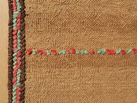 | ベラミンのラクダキリムを半分に切り分けたもの。 古い画像を探したところ、イランの田舎で撮影したと思われる当時の画像が見つかりましたので、参考画像としてご覧下さい。 破損があるのは細々と上下だけか?と思っていると、真ん中辺りにも左右の端に切れ込みがあった為、洗った後で2つに切り分けて房止めしました。 全体画像の上半分がこれです。 おそらくソフラの一種で、パンをこねるものか、食卓用のキリムです。 ご覧の通り、経糸もラクダの毛、僅かばかりの装飾を除けば、ほぼラクダで出来ています。 薄手のキリムなので、敷物とするには場所を選びますが、それでもスリットの無い構造かつ年代物らしい織りの細かさもあり、敷いて使ったとしても直ぐに破損するようなものではありません。 イランのキリムですから、ある程度の実用性、強度も考えて作られています。 |