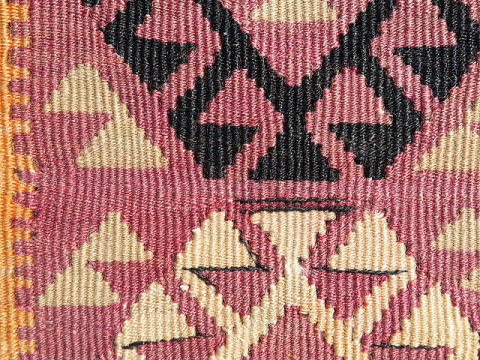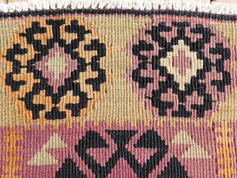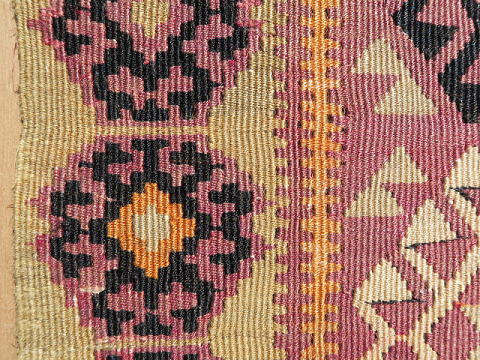 | マラティア県イェシルユルト(YEŞİLYURT/緑の国)自治区、ポルガ(村)のキリム。 マラティアの友人から買い付けた正真正銘のポルガです。 イェシルユルト自治区は、行政区分の変更によりマラティア市と合併したので、今は首都の行政区ですが、実際はやや南方に位置しています。 雪深い土地でもあり、春先にマラティア市を訪問して、遠くに見える雪が被った山々がこの地区です。 さて、本題のキリムはS340とほぼ同等、ほぼオリジナルで残っています。 もう一枚より色褪せしているのは、アクサライに送って修理してもらったため。 何処を修理したのか記憶がありませんが、ご覧の通り色合いが違うので、二枚の内これがアクサライに送った物だと分かります。 彼らはプロの職人なので、両面を近い色合いに調整します。 ただ、色合いを調整するなら、裏面を少し退色させれば終る筈です。 なぜ、表(おもて)面も色褪せしているのか謎でしたが、今回、掲載画像を準備していてその理由が分かりました。 もう一枚、色濃い方の画像を細かく見ていると、些細な色移りがありました。 修理を依頼しただけなのに、些細な色流れを見付け、それを消すために少しだけ表面を色褪せさせてから、微妙に裏面もトーンを落として仕上げた訳です。 私が2枚セットで依頼したのでその理由が分かりましたが、そうでなければ永遠に謎のままでした。 ポルガらしい渓谷に咲き乱れる花柄をイメージさせる図柄で構成されており、豊穣と水をもたらすドラゴンを描く事で完結しています。 後、もう一枚とは作風が少し違うため、姉妹の作品だと思います。 やや薄手な上にスリットが多いので、玄関マットよりも負荷の少ない場所での利用が向いています。 左辺に見える飾りの様なものは、輸出に際して税関が許可を出したという証拠の封印で、残してあります。 (紐を切れば、外せます。) |