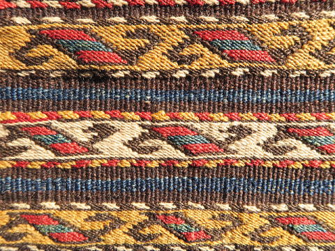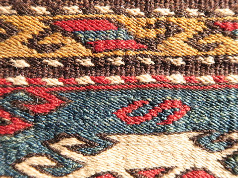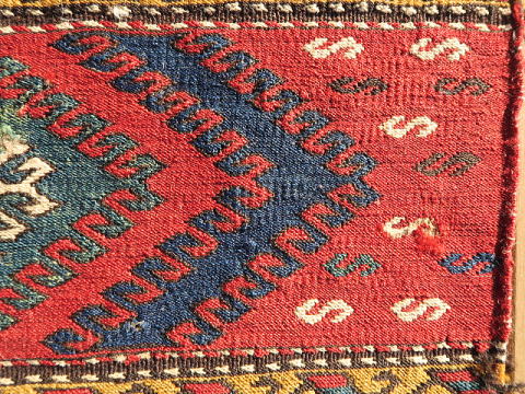 | イラン北西部に居住していたシャサワン族の衣装袋側面(小)。 デザイン的にも一番人気のドラゴンスマックで織られ、品質も高く、色合い、デザイン性とも素晴らしい。 ここでいう品質とは、紡いだ糸の細さと、その結果として現れる本体の薄さとしなやかさです。 鋭角な角の模様は糸が細く仕事が細かい事の裏付け。 上下のボーダー部に描かれたフック背面の黄色の濃さを見て下さい。 表面の緑はほんの少し退色していますが、裏面を見ればもっと濃厚。 古い緑色は黄色を藍で上染して染めるため、その中に含まれる黄味が退色しやすいからです。 制作された当時は、どの色も物凄く濃厚な色だったと思います。 このパネルは、S342よりダメージがあります。 ただし、スマックの構造上、解けてくるものではないので、ここには何かしら古い端切れを当てて頂ければ十分かと思います。 価格を安く設定していますから、飾りとするのであれば十分過ぎる状態です。 現状は洗っただけですが、上下の房止め(補強が必要な部位の経糸+αの小さな修理)は追加で行います。 |